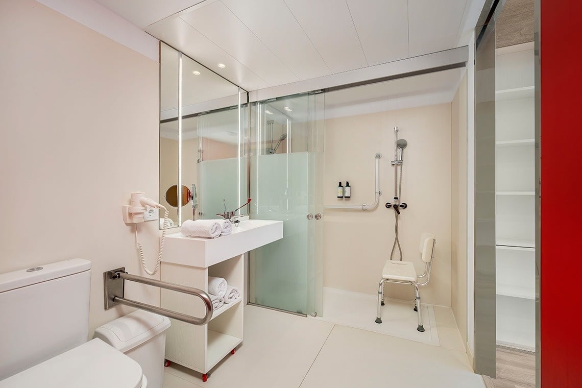 Designed for people with reduced mobility, this apartment combines accessibility and comfort. It features a bedroom with a 150 x 190 cm bed, an accessible bathroom, a fully equipped kitchen, and a living room with a pull-out sofa bed for two. It also has a furnished balcony. The accessible apartments face the street.